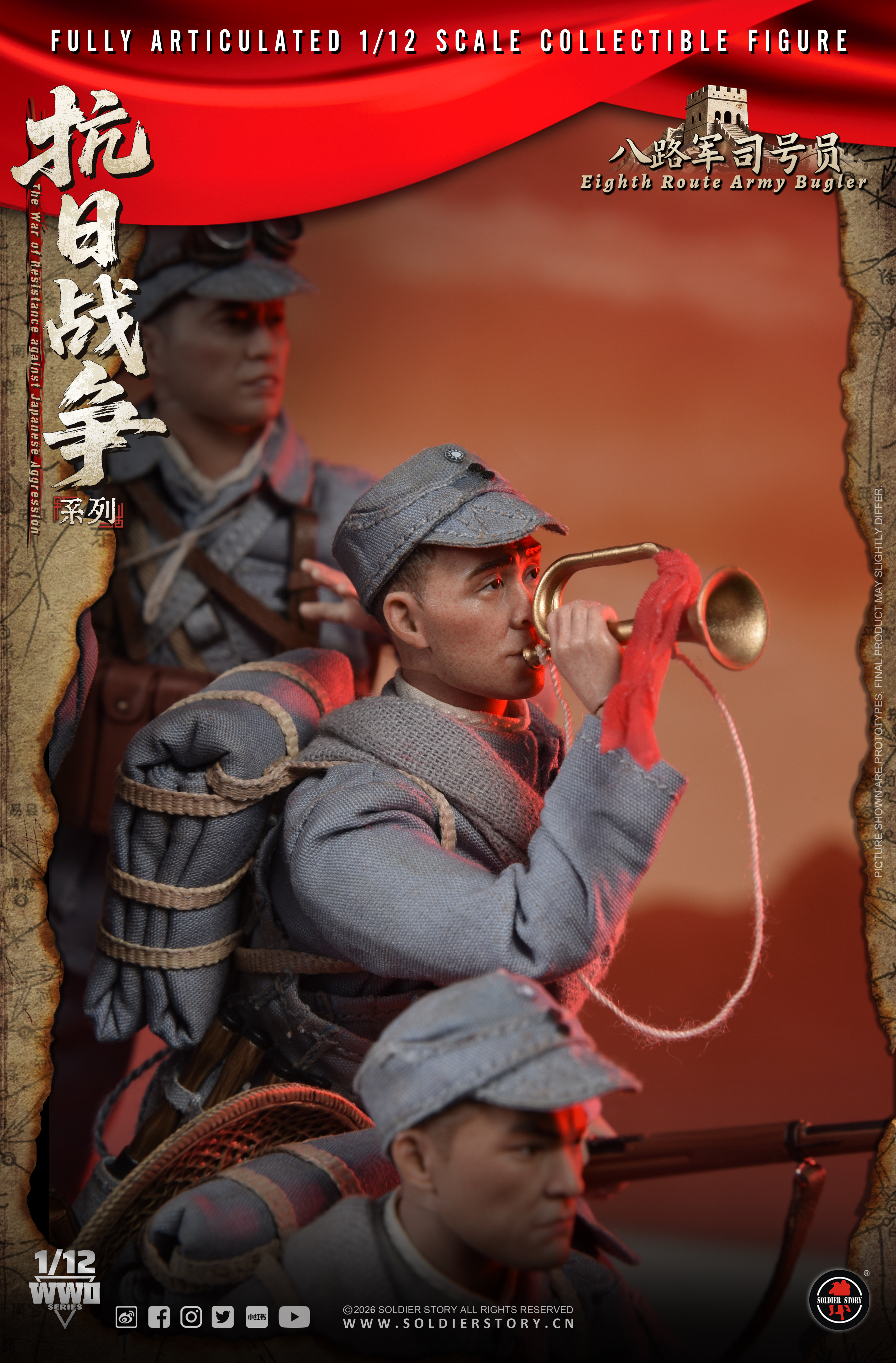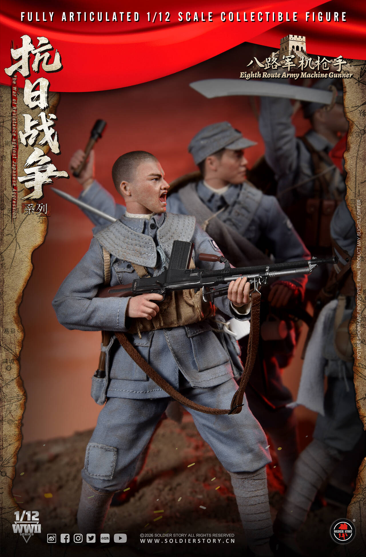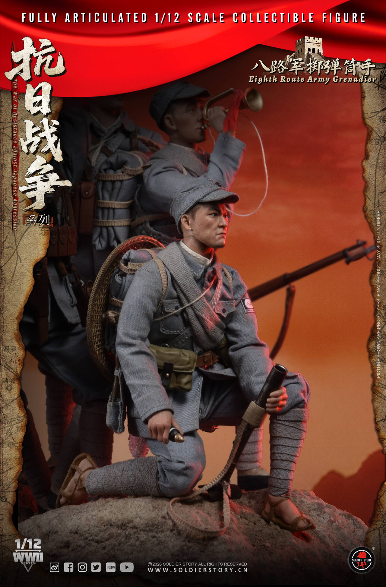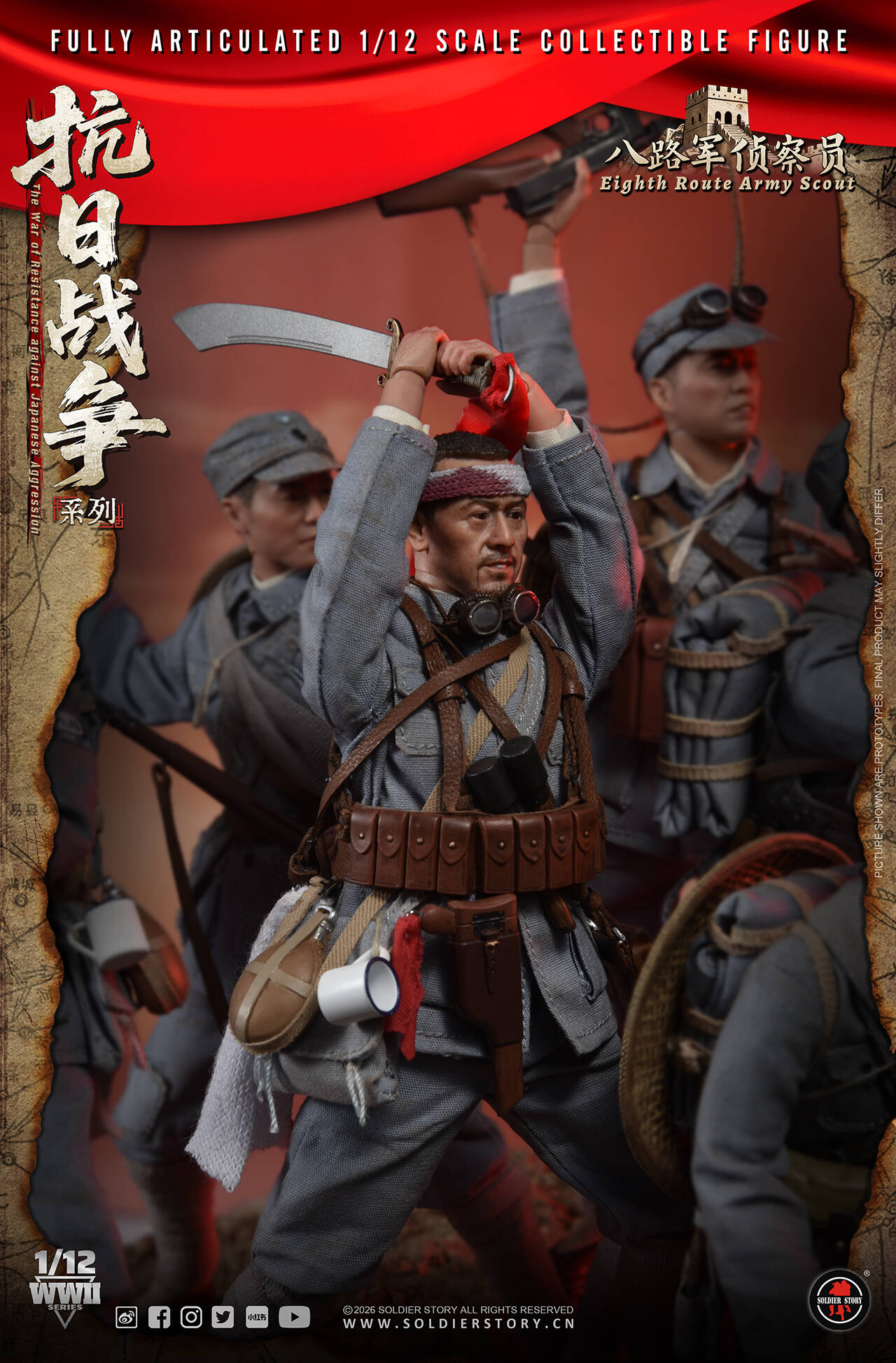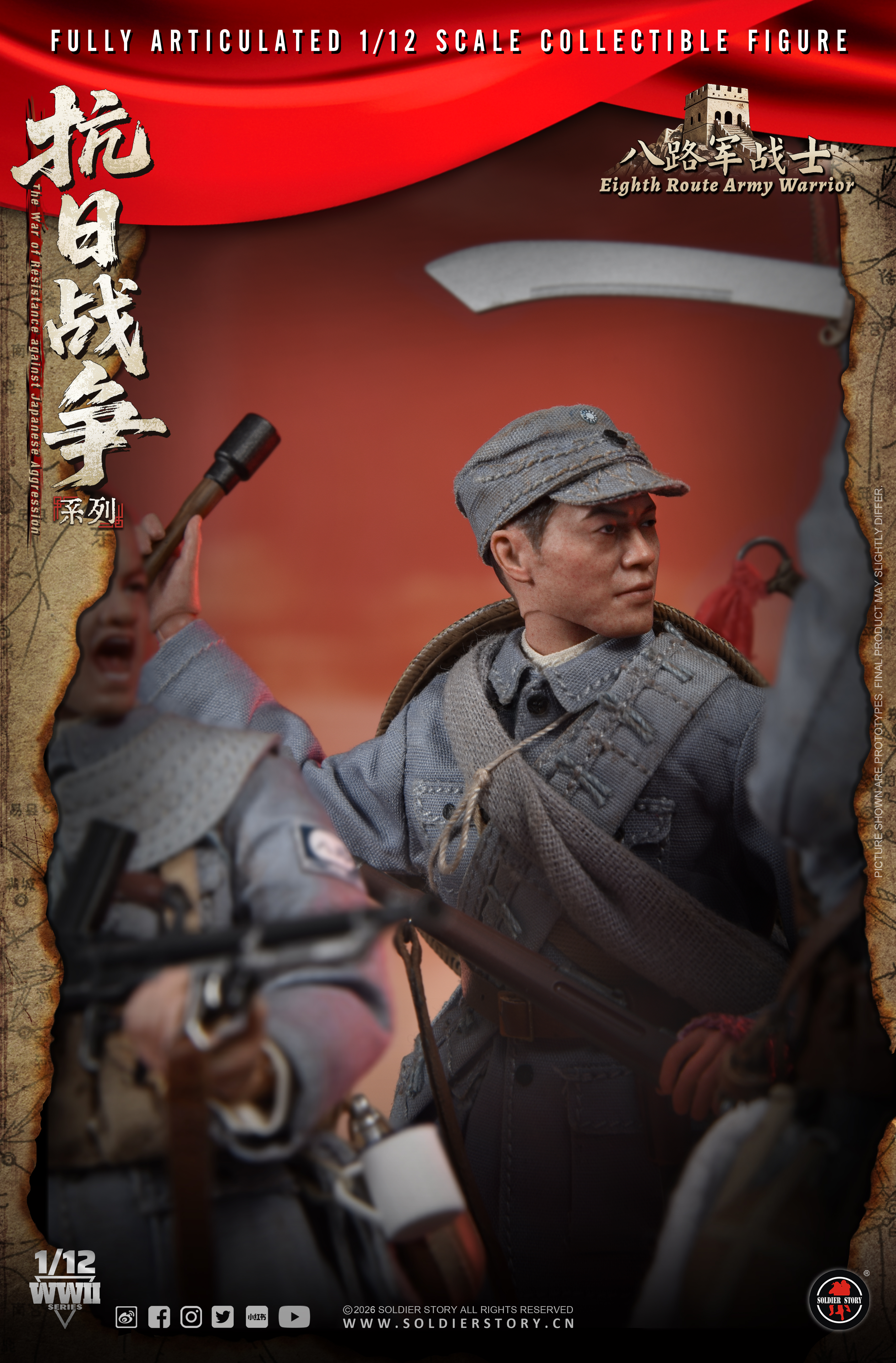 Soldier Story隆重推出全新1/12比例《抗日战争系列》珍藏可动人偶,以此深切缅怀在抗日战争中英勇牺牲的革命先烈。回首往昔,无数先烈抛头颅,洒热血,用血肉之躯筑起了坚不可摧的长城。如今,战争的硝烟虽已散去,但是我们应铭记历史,缅怀先烈,弘扬伟大的抗战精神,珍惜来之不易的和平,为实现中华民族伟大复兴而不懈奋斗。