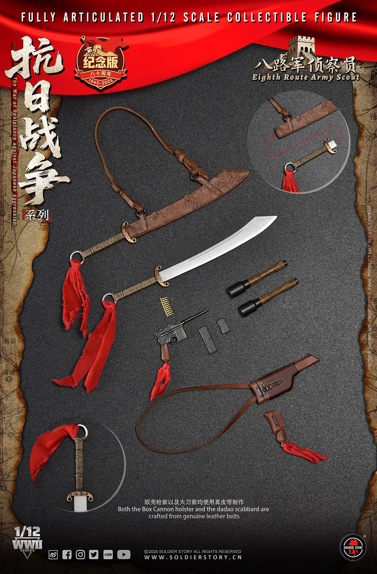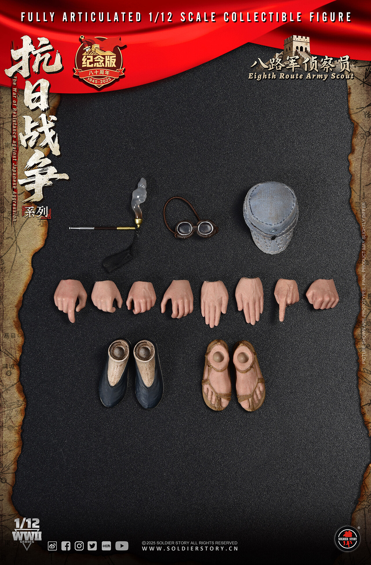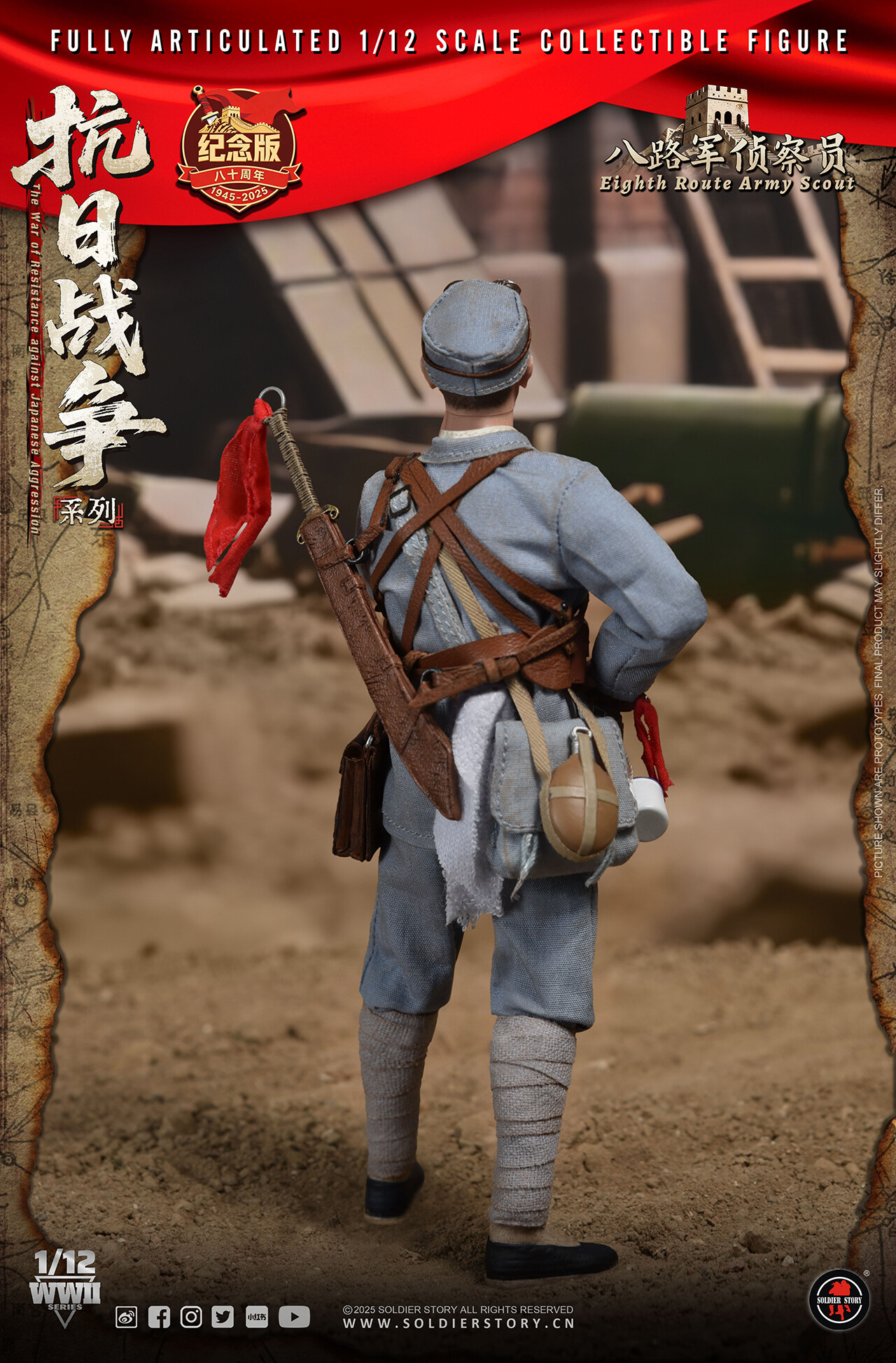 CNY 548.00为纪念中国人民抗日战争暨世界反法西斯战争胜利80周年,Soldier Story隆重推出全新1/12比例《抗日战争系列》珍藏可动人偶,以此深切缅怀在抗日战争和世界反法西斯战争中英勇牺牲的革命先烈。回首往昔,无数先烈抛头颅,洒热血,用血肉之躯筑起了坚不可摧的长城。如今,战争的硝烟虽已散去,但是我们应铭记历史,缅怀先烈,弘扬伟大的抗战精神,珍惜来之不易的和平,为实现中华民族伟大复兴而不懈奋斗。 现正式公布《抗日战争系列》首发两款-(其余款式敬请期待) SSM008八路军司号员及SSM010八路军侦察员。 -